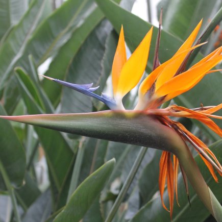 Krásné květy mohou o únorových víkendech lidé v palmovém skleníku obdivovat i díky Strelícii královské (Strelitzia reginae). Její domovinou je jih Afriky, vyniká nevšedním květenstvím, jež připomíná hlavu ptáka jeřába. Ve volné přírodě je podivuhodně opylována drobnými ptáky.