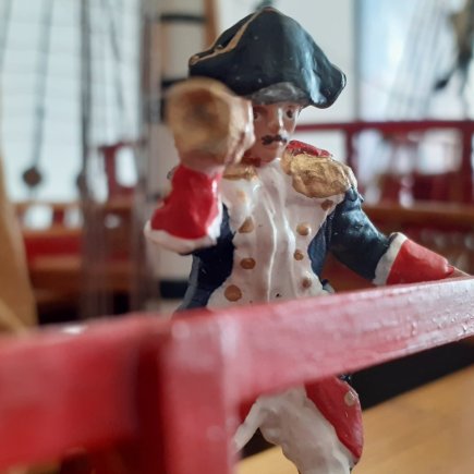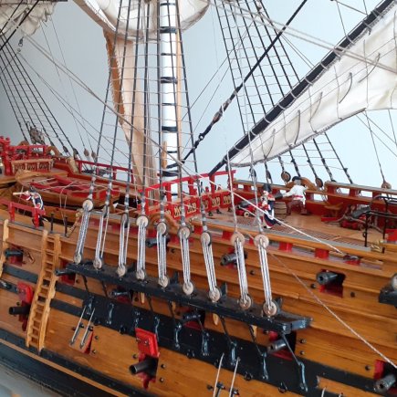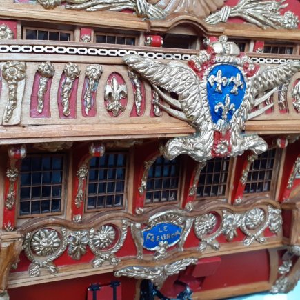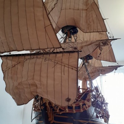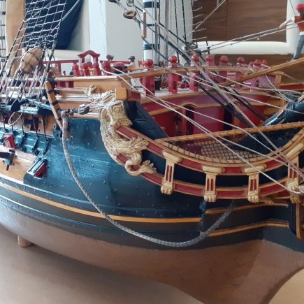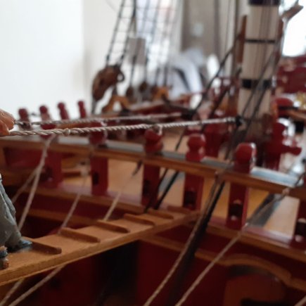 „Okna na zádi jsou vypálená laserem do překližky, kanony jsou z 3D tiskárny. To jsou ale jen detaily, jako celek je loď poctivá ruční práce. Například jen na lanoví jsem potřeboval 400 metrů provázku a je v něm 450 kladek, zlacené ozdoby jsou stejně jako postavy námořníků z moduritu,“ popisuje modelář.