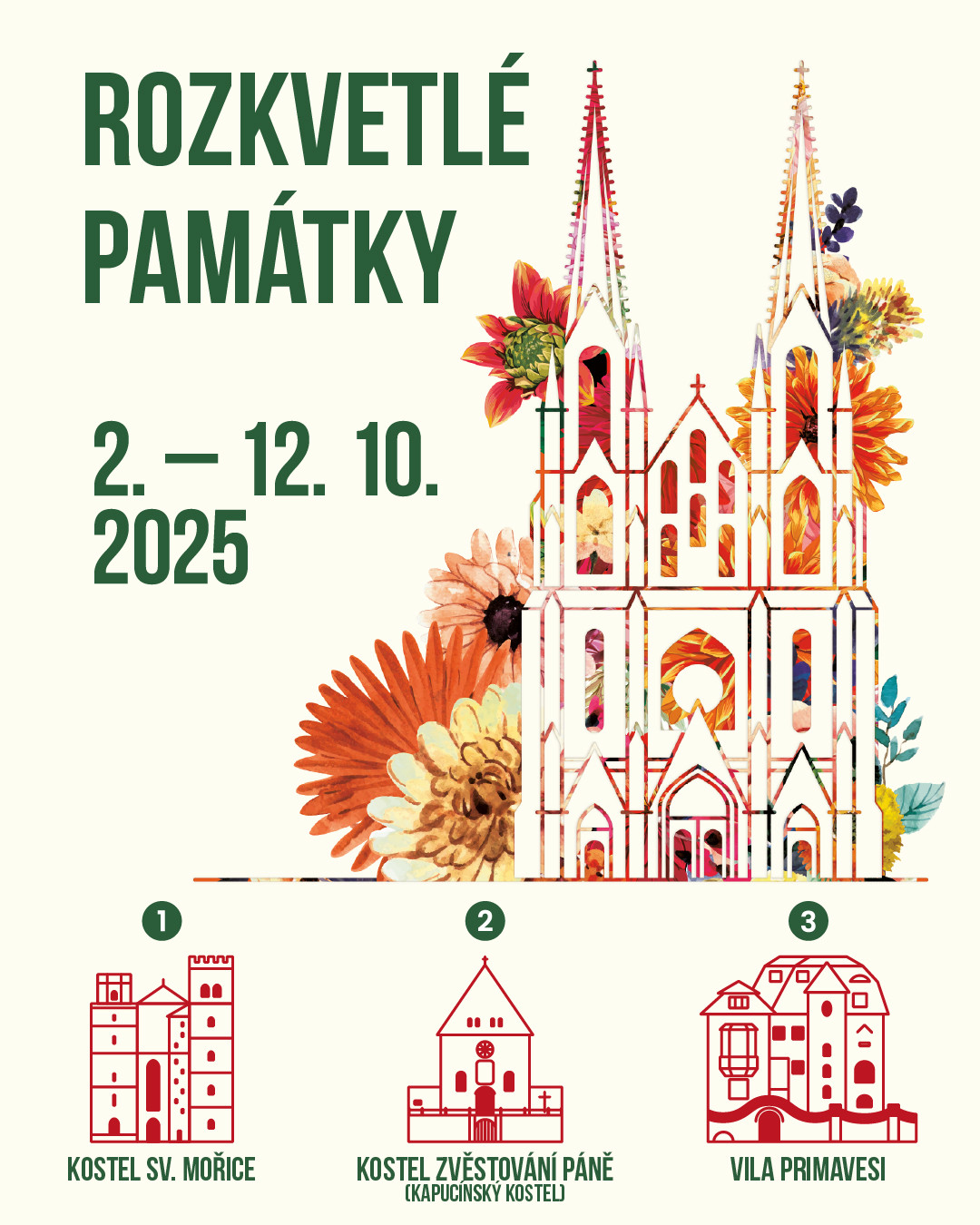 Oblíbený projekt Rozkvetlé památky i v roce 2025 rozzáří květinovými aranžmá prostory kostelů Sv. Mořic, Zvěstování Páne (kapucínský) a také ve vile Primavesi od 2. do 12. října 2025.
