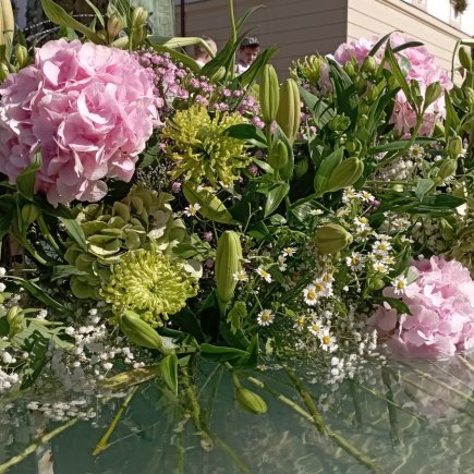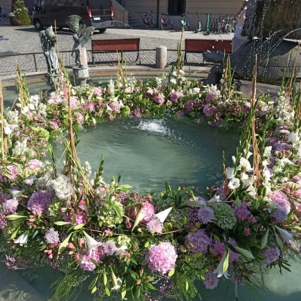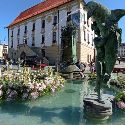 V plánu jsou dvě obměny květinového aranžmá. A to ve čtvrtek 31. 8. a v pátek 8. 9. Barevné ladění aranžmá se pokaždé změní. Květiny budou kašnu zdobit do poloviny září.