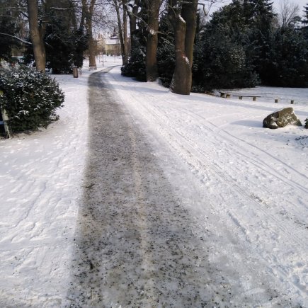 Jakmile napadne sníh, je potřeba začít upravovat chodníky a cesty v parcích. Kvůli ochraně dřevin chodníky nesolíme, ale používáme speciální zametač na sníh a cesty sypeme drobnými kamínky (inertním materiálem), které jsou k přírodě mnohem šetrnější. Také se upravují jen hlavní komunikace, tak na to myslete, až se půjdete projít.